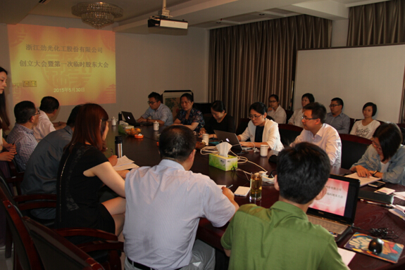 2015年5月30日,浙江勁光化工股份有限公司創(chuàng)立大會暨第一次臨時股東大會在公司會議室隆重召開。股份公司發(fā)起人及發(fā)起人的代理人出席了會議,代表股份5850萬元股,占股份有限公司總股本的100%。大會一致通過了《關(guān)于<浙江勁光化工有限公司整體變更設(shè)立浙江勁光化工股份有限公司方案>的議案》等24項議案。